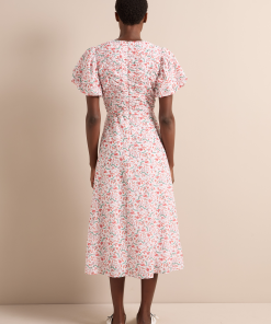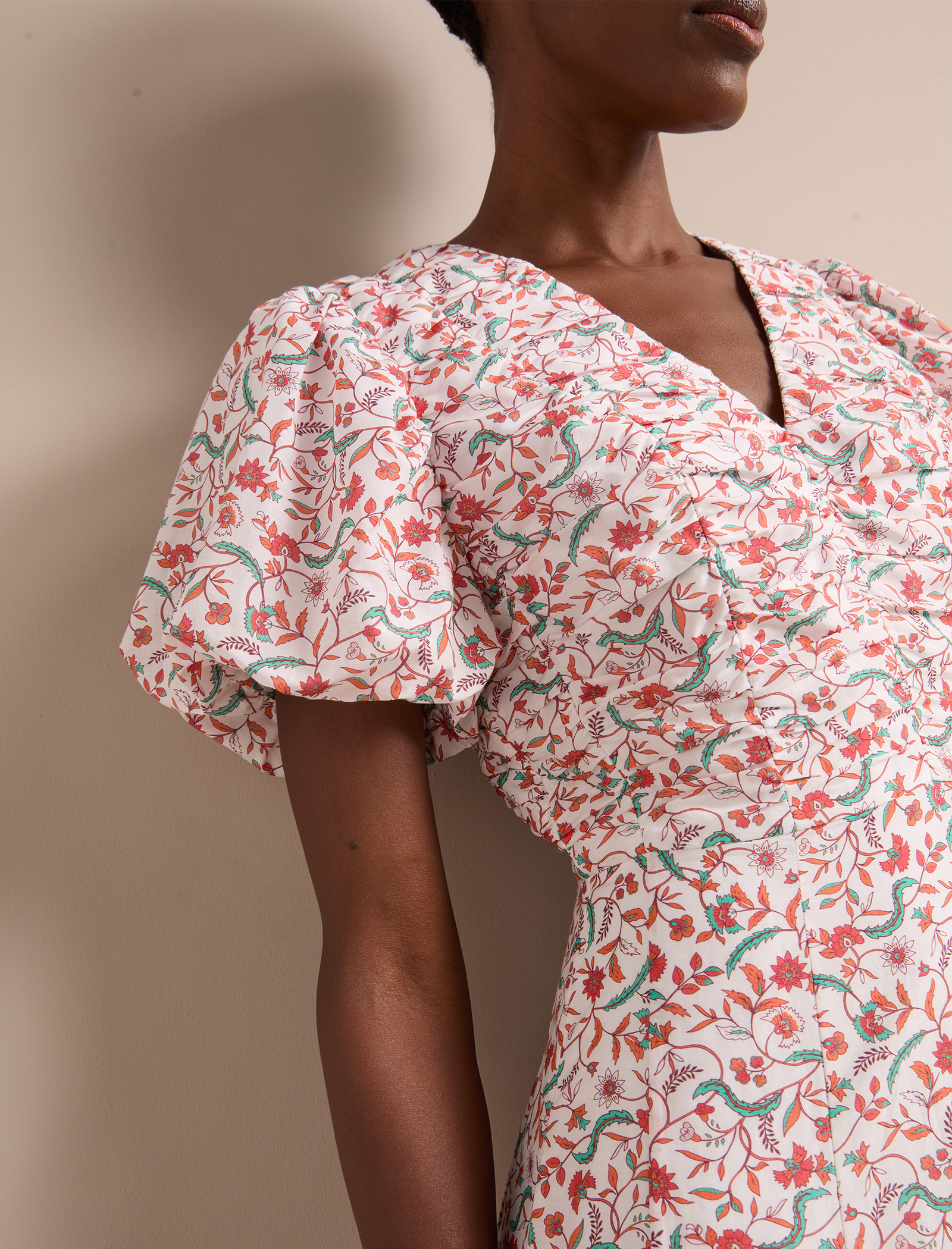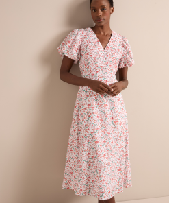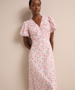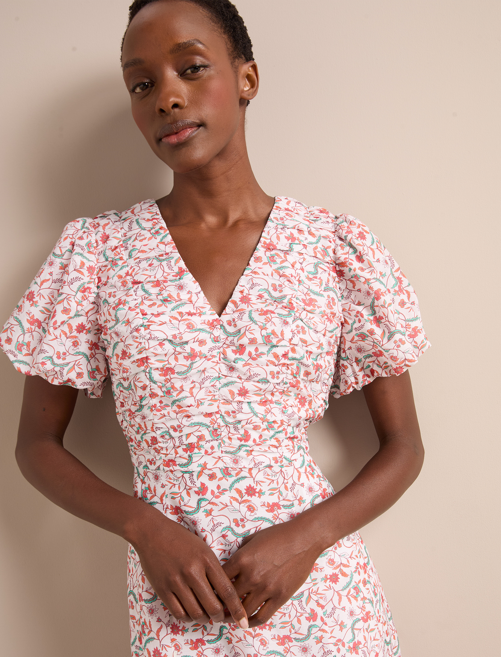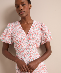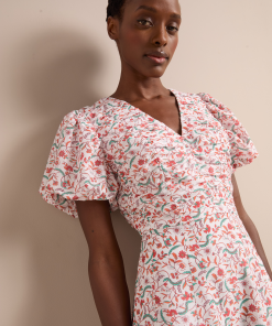 Designed in a luxe, naturally breathable cotton silk voile, the Elisa dress is ideal for smarter summer lunches and warm weather events. Featuring a pretty trailing feather print, the bubble-hem sleeve and ruched bodice give it modern femininity. Style with a strappy heel for effortless elegance.